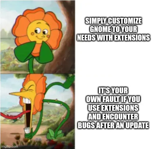 So if I want various things in fedora 42, but I have to refrain because my favorite extension hasn’t been ported from fedora 41. I didn’t use gnome largely because I got tired of keeping up with the extension mess.