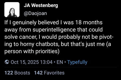 Many domestic cats are vicious, deranged little fuckers, but they aren’t a threat to humanity because they’re too small and generally prefer to live with humans. Removing those limitations does not create a threat to humanity. An absurdly large domestic cat with an attitude problem would (probably) not end mankind, but would (maybe) make it onto a few TV shows and get a meme. And AI is not a threat to humanity because it can’t think or operate independently. Even if you removed those limitations, it would no more spell the inevitable dominance of fascism (odd endpoint you chose there but hey ho) than a gigantic tabby cat who didn’t like his dinner. Because, again, logic doesn’t work like that.