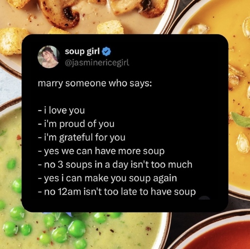 minus-squareParadoxSeahorse@lemmy.worldlinkfedilinkarrow-up20·16 days agomarry someone who says: i love you i’m proud of you i’m grateful for you yes we can have more jasmine rice no 3 rice in a day isn’t too much yes i can make you jasmine rice again no 12am isn’t too late to have jasmine rice