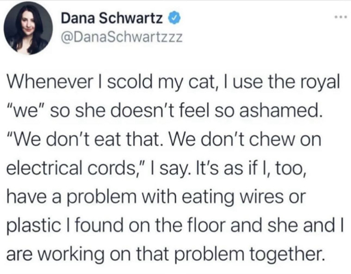 A Twitter post by Dana Schwartz @DanaSchwartzzz that reads Whenever I scold my cat, I use the royal we" so she doesn’t feel so ashamed. “We don’t eat that. We don’t chew on electrical cords," I say. It’s as if I, too, have a problem with eating wires or plastic I found on the floor and she and I are working on that problem together.