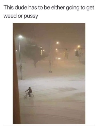 A picture of a guy on a bicycle taken from a window. The roads are covered in snow and the weather looks cold and miserable. Caption reads “This dude has to be either going to get weed or pussy.”
