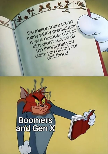 They’re saying that you say you did that as a kid. But many kids did that, and unlike you, didn’t survive it, so now kids aren’t allowed to do that.