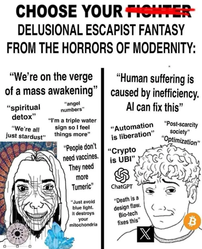 I choose neither, and instead day dream about fully automated luxury gay space communism, knowing I’m gonna die before such a thing could ever come to fruition.
