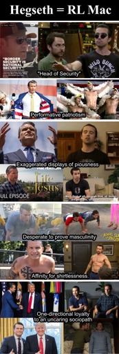 Yeah, but Mac has a soul and is genuinely good a few times through the series. I don’t think I’ve ever seen any sort of redeeming behavior from Hegseth.