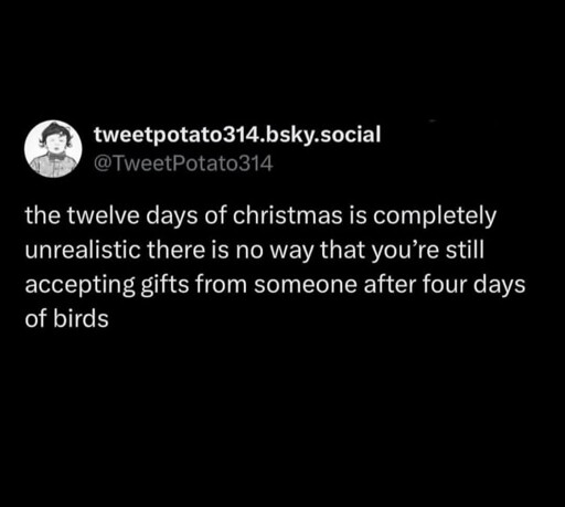 Children’s carols aren’t obliged to make any kind of sense, but I always imagined it as an aristocratic lady with a huge country manor getting lovebombed with outrageous gifts from her suitor, just because he can.