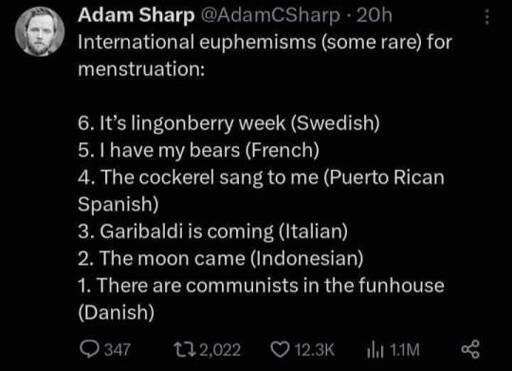 A bit of context for the Indonesian one, the way “moon” is used there is similar to month, so it’s basically “the time of the month is here” said as “datang bulan”
