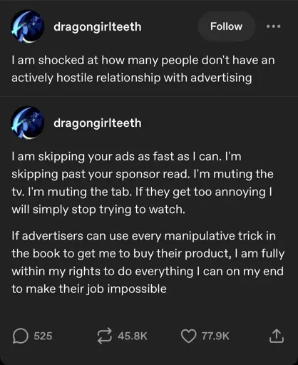Don’t claim your relationship with ads is “actively hostile” if your actions can be described as “skipping” and “muting”.
