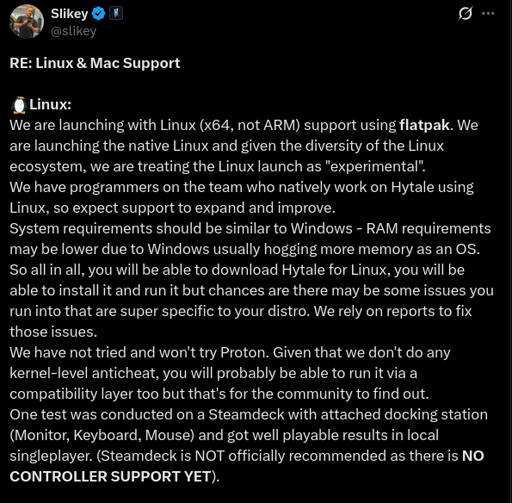 mr_MADAFAKA@lemmy.ml to Linux Gaming@lemmy.worldEnglish · 1 month agoHytale's Co-Founder and Tech Director, revealed that Hytale will offer experimental x64 Linux support via flatpak at launch, with plans to enhance it based on community feedbacklemmy.mlimagemessage-square21linkfedilinkarrow-up1260arrow-down17file-text