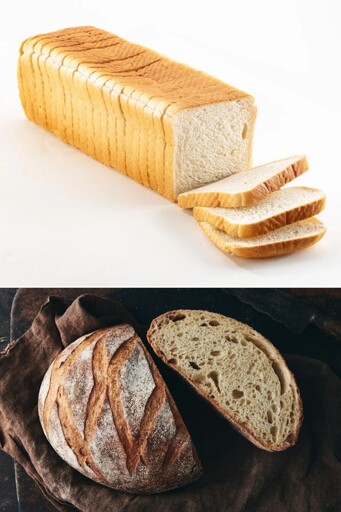 The second picture is of a sourdough loaf. This usually uses wholemeal wheat flour, often mixed with rye or other grains for better texture, and is a fairly tedious bread to make with multiple stretch and fold sequences and long resting periods, allowing lots of gluten to form, which means every stretch and fold sequence doesn’t mix the dough but rather layers and shapes it. The yeast comes from a sourdough starter, and is allowed to ferment longer, which is why you get an intense flavour. It bakes quick in a Dutch oven first covered then uncovered, allowing it to fluff up but then shape a hard crust. You get much larger bubbles and an internal structure of long strands of gluten forming swirls and such.
