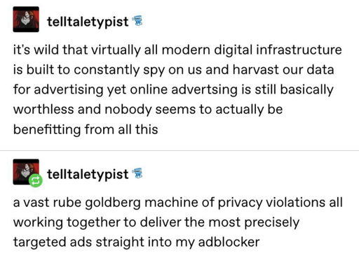 Even if you block ads, if you still use platforms owned by tech mega-corps, they have your data. Sure you might not see the targeted ads, and so you think you’re coming out ahead, but you don’t realize that every piece of content you see between the ads you’ve blocked is being filtered to influence the way you think about the world.