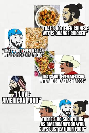 No shit. Orange chicken was invented by a Chinese-American chef in Hawaii. Chicken alfredo was invented in the US by combining the Italian dish fettuccine al burro with cream and chicken. And breakfast tacos were an adaptation of a Mexican dish tacos de guisados, except Texans used eggs, instead of yesterday’s stewed leftovers. (Also, I’m not sure the OP and community admin even gets the point.)
