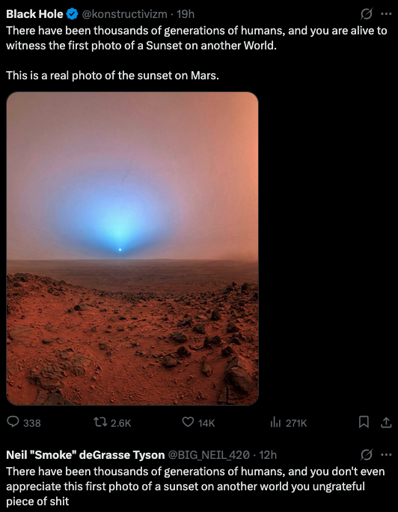 minus-squareExLisper@lemmy.curiana.netlinkfedilinkEnglisharrow-up8arrow-down1·26 days agoLooks like shit. Earth blows this dead red rock out of the water, again. No competition. Team Earth!