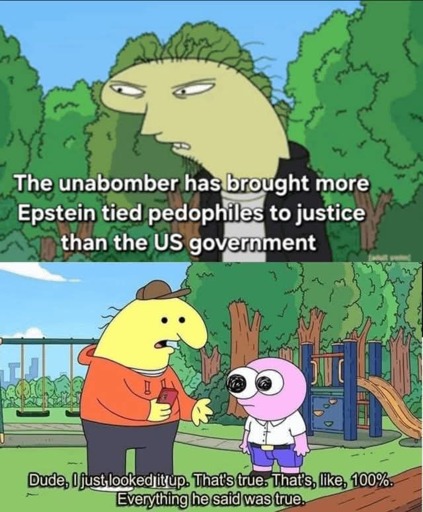 minus-squareRedjard@lemmy.dbzer0.comlinkfedilinkarrow-up18·22 days agoI checked a few people and found nothing, So I’ll take that as 1 guilty and everyone else innocent then.