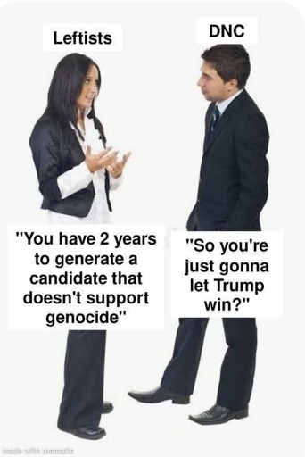 Like, seriously, look at the big picture. Do you think Kamala who would have still supported Israel would have been worse for Gaza? It’s literally not possible. You guys fucked up the entire planet in your pride.