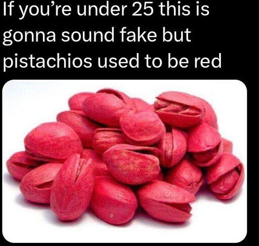 I also figured this was just a “let’s screw with the youth”-type post. We used to eat pistachios all the time when I was a kid (I’m 35) and I don’t think I’ve ever seen a red one before today. They were always beige/greenish.