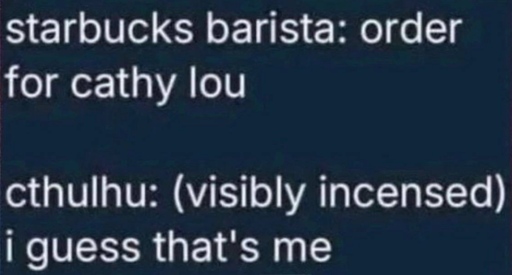 You guys think Starbucks hasn’t been waiting for Cthulhu’s coming all this time to serve him? Black and green colors? That two-tailed mermaid? Yeah, that’s Stæ’Rhabhuk, Holder of the Chalice and Slaker of the Dark Lord’s Thirst.