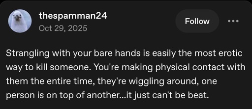 CHERYL: Like, a big sweaty fireman carries you out of a burning building, lays you on the sidewalk, and you think, “Yeah, okay, he’s gonna give me mouth to mouth.” But instead, he just starts choking the shit out of you, and the last sensation that you feel before you die is him squeezing your throat so hard that a big, wet, blob of drool drips off his teeth and just “flurr”, falls right onto your popped out eyeball…